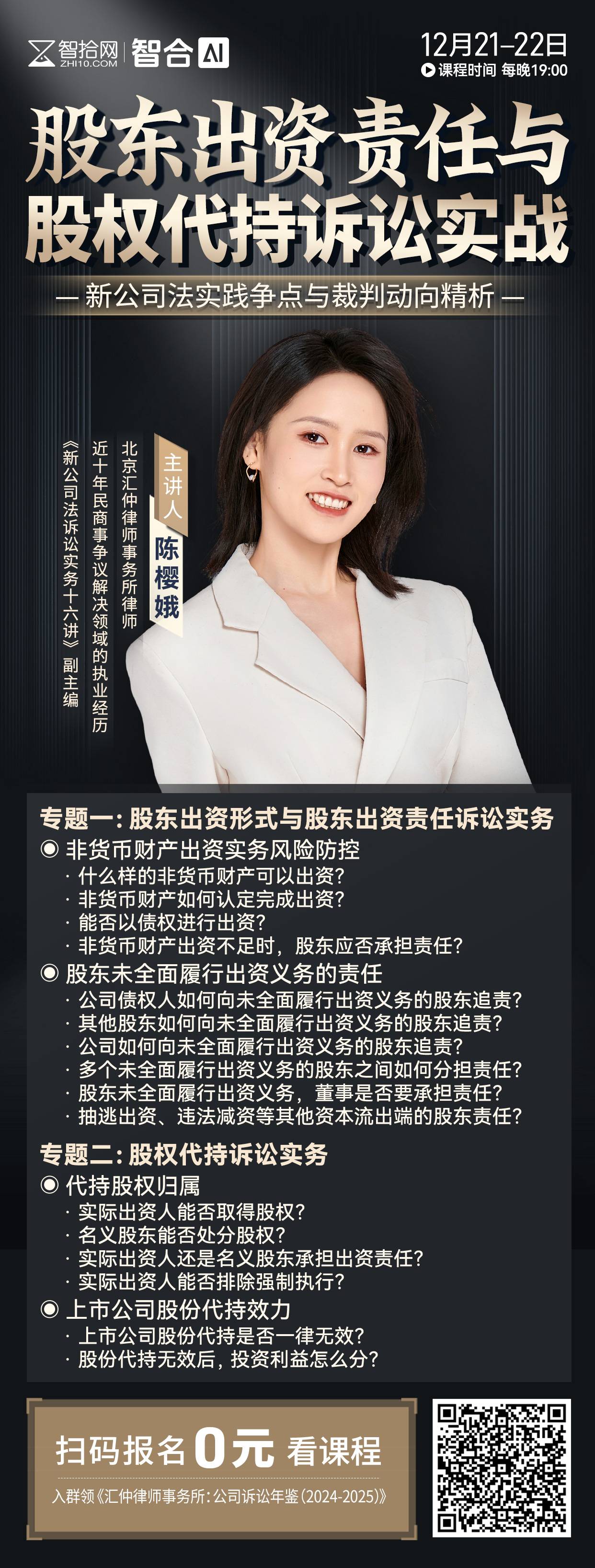 【两天免费直播】陈樱娥:股东出资责任与股权代持诉讼实战